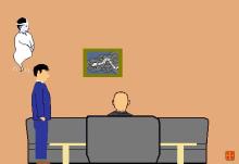 社長室に上山が入ると、田丸が今か今かと待っていた。幽霊平林も壁からスゥ~っと透過して中へ入った。