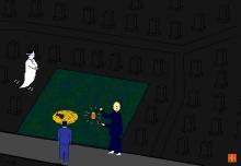 危うい! と慌(あわ)てた上山は、すぐに否定して取り繕(つくろ)った。その上で漂う幽霊平林は、しまった! と、ばかりの、しかめっ面(つら)である。束の間の興奮により青火が頭上に灯ったのだ。幽霊に恐怖心はないものの、この場合の幽霊平林は少し顔の青さを増して蒼ざめた。上山は、なにしてんだっ! と一喝しそうになる口をグッ! と噤(つぐ)んで堪(た)えた。その瞬間、幽霊平林と目線がピッタリ合ってしまった。上山が睨むと、幽霊平林は気不味(まず)さからか、目線を落とした。