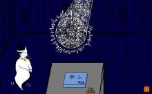 胸元の如意の筆を手にした幽霊平林は、両瞼(りょうまぶた)を静かに閉ざした。その状態が一、二分ばかり続き、両瞼をふたたび開いた幽霊平林は、如意の筆を軽く振った。すると、たちまち霊界番人が現われる前兆の一筋の光が彼方(かなた)より住処(すみか)目指して降り注いだ。次の瞬間、光輪がその道を伝うように降下し、幽霊平林の前へ現れた。