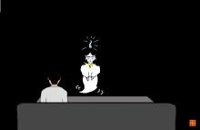 上山は幽霊平林に思わず叫んだ。その幽霊平林は緊張のためか言葉を発しない。ただ、彼の頭上には、気持の昂(たかぶ)りによって生じる青火でけが灯っていた。震動が止まったとき、上山の視界は暗闇に閉ざされた。瞬間、上山は停電か…と思った。しかしそれは、停電などではなかった。暗闇の中に見えるものといえば、青火を頭に頂(いただ)いた幽霊平林だけである。やがて、上山も少しずつ異変に気づきだした。